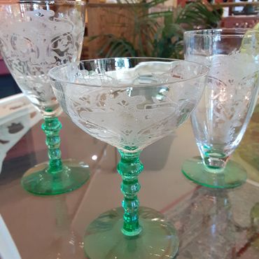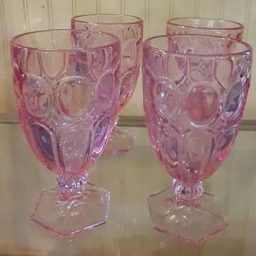 Heavy glass footed iced tea/water goblets in a geometric design of ovals and panels reflecting the modern taste of the times.